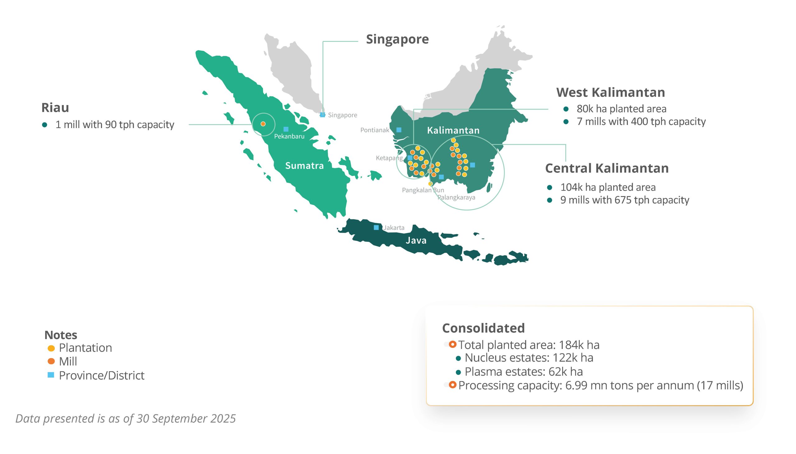 Bumitama Agri’s operations are based in Central and West Kalimantan, and Riau with corporate offices based in Singapore and Jakarta.